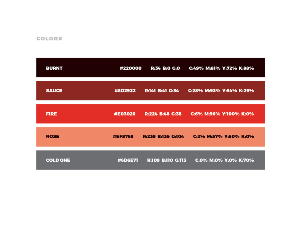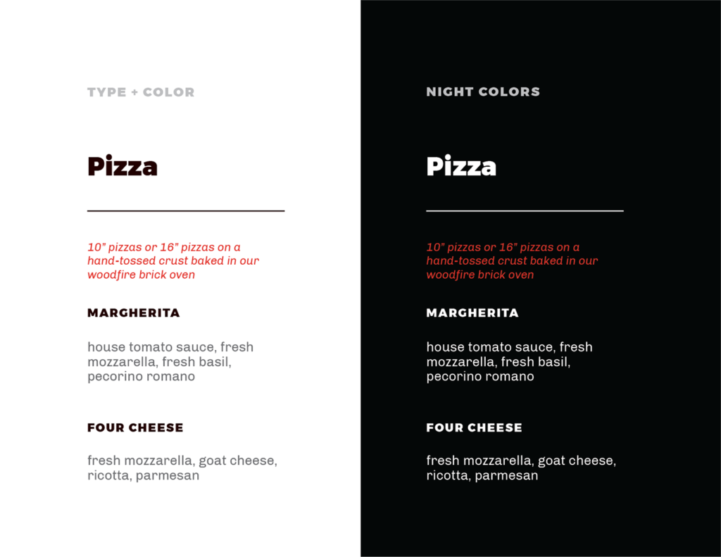 Finally, we created a system of colors, which is really where this brand came to life. By embracing the “night” theme of the restaurant, we focused on dark backgrounds and bold colors that looked like a neon pizza sign on a dark night. We applied this to everything and it became the core of the system – black t-shirts with red logos, and black menus with white and red text.
