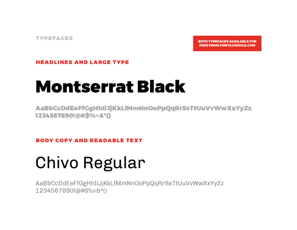 Next, we created a typographic palette. I originally selected Montserrat as the only typeface because of its availability, but after reading Bethany Heck’s piece on multi-typeface systems, I realized that Chivo could accomplish body copy designations better than Montserrat could, so we used them both. They are both simple sans-serifs, but the geometric edges to Chivo make it more readable and unique as body copy text.
