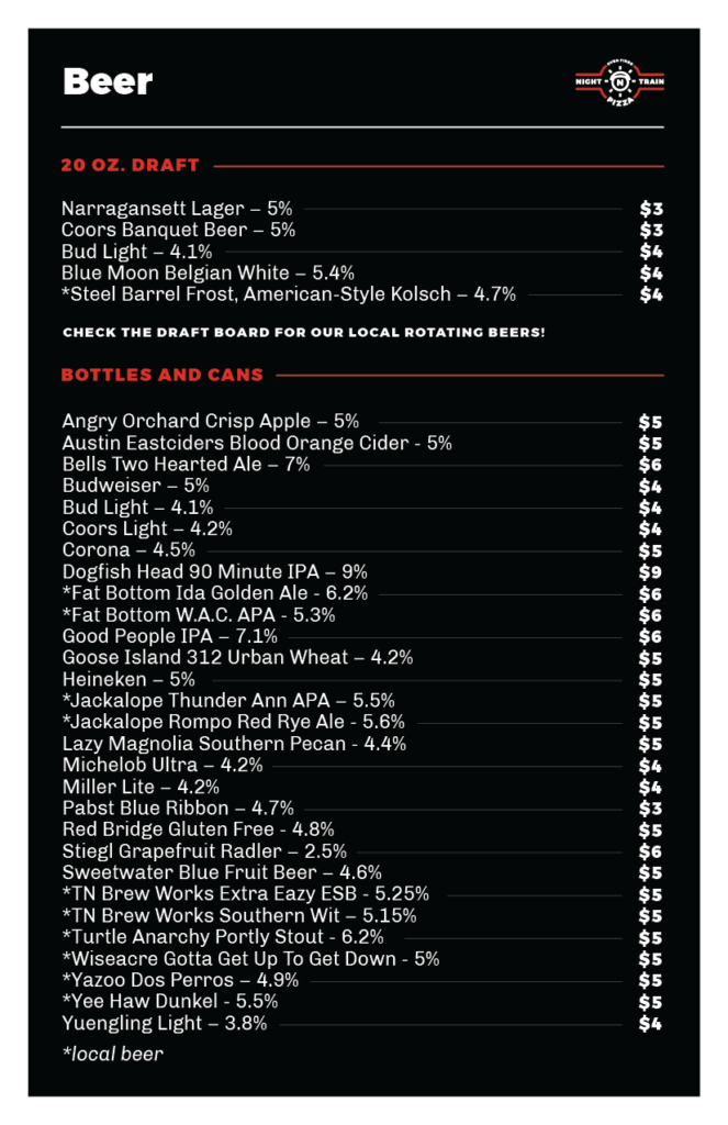 When Night Train finally opened in August of 2017, I had the incredible experience of being able to sit in a restaurant that I branded and enjoy some great pizza. They had a pizza with street corn on it that was a personal favorite, and they served soft drinks in the transparent red plastic cups that are ubiquitous in local pizza places. This was definitely one of my all-time favorite projects.